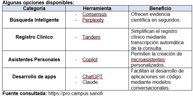 De asistente en consultasAlgunos consultorios médicos ya cuentan con herramientas inteligentes que facilitan la vida tanto a doctores como a pacientes. Imagina buscar en segundos la evidencia científica más actualizada o que un programa transcriba automáticamente lo que se dice en la consulta, permitiendo que los profesionales se concentren únicamente en la relación con el paciente. Estos son sólo algunos ejemplos de cómo la IA está liberando tiempo y mejorando la precisión del diagnóstico, sin reemplazar el toque humano que caracteriza a la medicina.